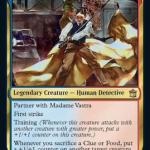 Madame Vastra is a four-drop in Green and Blue that creates a Clue and Food token whenever a creature is dealt damage. That creature also dies if it was dealt damage by the lizard detective. Jenny Flint is a three-drop in the colors Blue and Red, showcasing First Strke and Training. As an added synergy with Madame Vastra, Jenny Flint can put a +1/+1 counter on another target creature when a Clue or Food token is sacrificed.