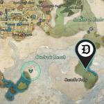 To find this pond, follow the road to the east of the POI’s name on the map, where the “palm” of the hand is. Enter through a tunnel found off the road, and you’ll eventually come to a small body of water. Be ready to get your feet wet, because you’ll need to jump in and head through the opening at the bottom of the pond. From here, you’ll see a small room with a metal grate of a ceiling, and the Golden Plaque of Oaths will be sitting atop folded blankets amid the rubble.