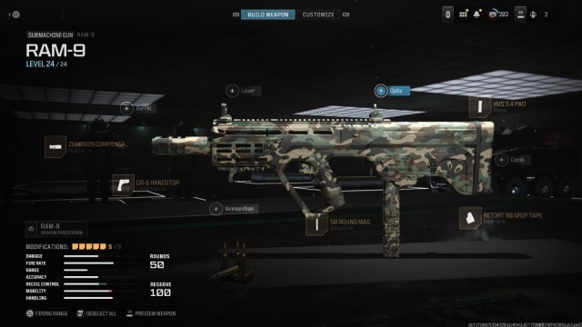 Meanwhile, the HVS 3.4 Pad and Retort 90 Grip Tape also improve accuracy and gun kick control to compensate for the RAM-9’s unruly recoil pattern. To get the best of both worlds, the DR-6 Handstop improves handling and mobility, and the 50 Round Mag makes it possible to take down multiple enemies at once.