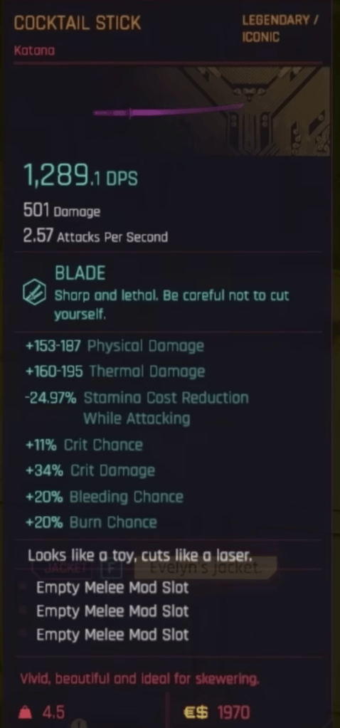Comically named and weak and pink in appearance the Cocktail Stick is nothing to sneeze at. Though it’s lower on our list, many people consider it the best katana in Cyberpunk 2077. You can get this weapon in the Automatic Love quest, obtainable in the green room which is optional to search. It’s right under a neon sign that says “bliss.”