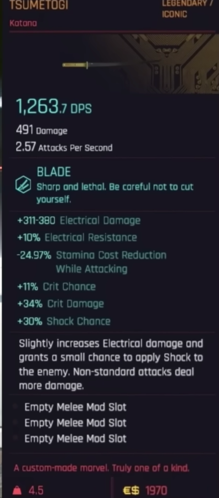 The Tsumetogi is also extremely fast, dealing five swings a second, faster than most other katanas in the game. On top of that, it has standard modifiers like an increased crit chance, crit damage, and even provides you with a bit of electric resistance.