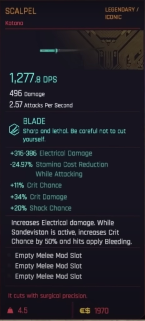 The scalpel also works well with a bullet-time ninja build, pairing greatly with the game’s best sandevistans. This katana has a high damage output and even has a 10 percent chance to deal a shock status effect. With a Sandevistan is active, your chances to get a critical hit go up 50 percent, and the chances to cause a bleeding effect go up by 100 percent. With the right time-slowing build, you can take down opponents swiftly and leave them reeling.