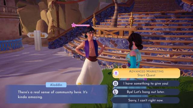 Advanced Marketing is the last Friendship Quest offered by Aladdin. You can access it after reaching Level 10 Friendship with Aladdin, unlocking WALL-E, progressing with Mulan, Kristoff, and Tiana, completing The Beast’s Level 10 Friendship quest A Gift in Crimson, and unlocking the Forgotten Lands.