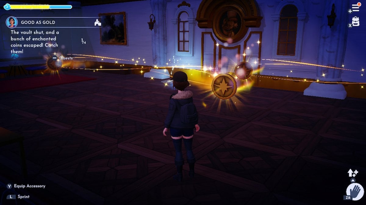 With the store now secure, Aladdin leads you to the vault—only for enchanted coins to come bursting out! You’ll need to catch all four coins inside the store before moving on to the next phase.