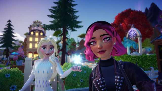 The player taking a picture with Elsa using ice magic in Disney Dreamlight Valley.