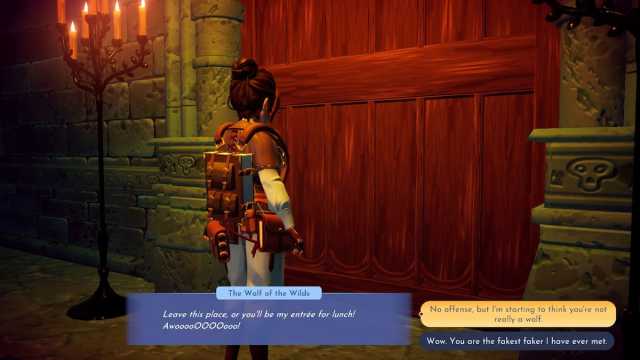 A voice will respond from the other side and you’ll quickly realize it’s just someone pretending to be a wolf rather than an actual wolf as Merida had feared. The person behind the door is adamant they’re a real wolf though, so you need to gather evidence to disprove them.