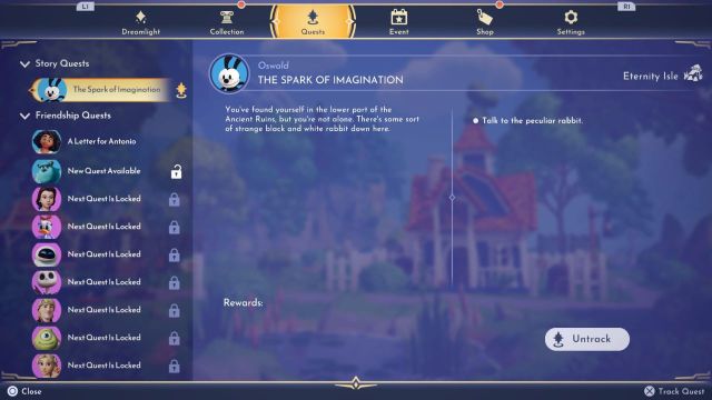 Once you’ve spoken to Oswald, you will automatically complete The Spark of Imagination quest in Disney Dreamlight Valley and begin the Monochrome Mystery quest.