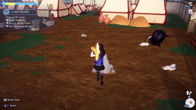Talk with Mushu and he’ll say you’re late for training camp so you have to help clean up. Navigate around the camp and work on breaking eight rocks with your Royal Pickaxe and digging up 12 rice spills with your Royal Shovel.