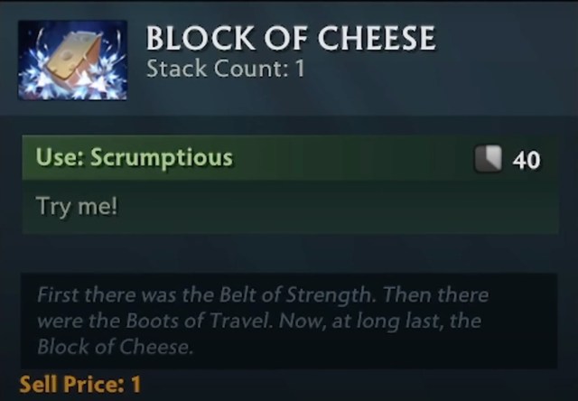 The Block of Cheese in Dota 2 is a consumable item that players can get by combining three Greater Healing Lotuses, and the regular Cheese dropped by Roshan after his second death.