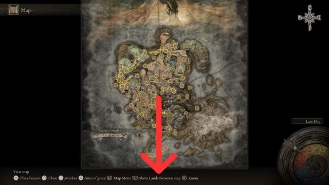 - Look at the bottom of the screen, and you should see the option to “Show Lands Between map.”
