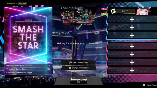 From this menu, you can choose any game mode you’ve unlocked, like Smash the Star, a typical four-versus-four team-deathmatch mode. After you’ve selected a mode, you will automatically start matchmaking. Alternatively, you can also choose Private Party from the Versus menu if you’d like to set up a custom match with others or find an existing private room.