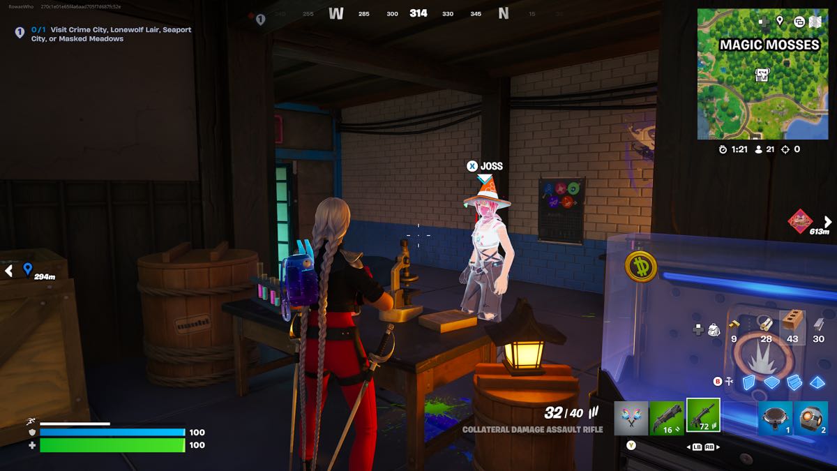 Joss is underground at Magic Mosses in her lab where she has a lot of interesting stuff for sale. In her lab are all kinds of loots for sale from shield potions to boons and legendary weapons. It can all be yours—for the right price.