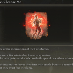 Another option to cure Scarlet Rot is using the incantation “Flame, Cleanse Me”. This faith-based spell requires 12 Faith to cast, making it accessible at a relatively low level. The incantation requires a seal and 14 Focus Points to cast and can be found on one of the corpses in the Fire Monk Camp just southwest of the Eastern Tableland site of Grace in the Liurnia of the Lakes area, north of Limgrave.