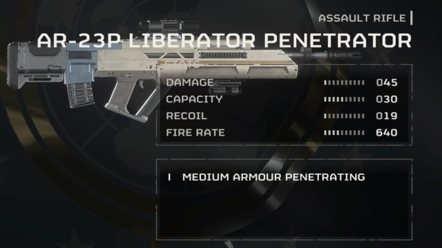 - AR-23 Liberator (light armor piercing rounds): Default weapon