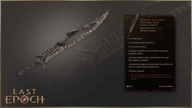 Crafted for the new Mastery, Warlock, Spine of Malatros is a two-handed sword that changes both visuals and mechanics. With this equipped, your Chthonic Fissure will no longer release Spirits but will cast Flame Whips instead.