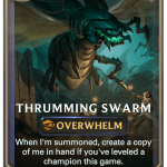 Thrumming Swarm is an Epic seven mana Unit from Shurima with 8/4 combat stats, the Overwhelm keyword, and a summon ability that creates a copy of itself in hand if you manage to level up a champion during the game.