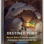 Destined Poro is a one-mana 1/1 Common Poro-tribe unit with a Round Start ability that transforms into Exalted Poro if you leveled up a champion earlier in the game. Its Exalted form gains +1/+1 stats and obtains three random keywords.