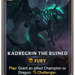 The corrupted version of Kadregrin continues to provide utility like his original form. But instead of boosting stats for all of your future Dragons, Kadregrin the Ruined gives one of your Champions or Dragons the Challenger keyword.