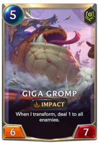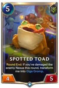 Spotted Toad is a five-drop 4/5 that transforms into Giga Gromp at the end of the round if you damaged the enemy Nexus that round. Upon transforming into Giga Gromp, the Summoner’s Rift monster deals one damage to all enemies, has its stats increased to 6/7, and gains the LoR keyword Impact.