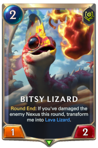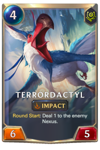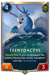 Similar to Spotted Toad is Teenydactyl, a four-cost 4/3 that transforms into TerrorDactyl at the end of the round if you damaged the enemy Nexus that turn. The TerrorDactyl nails its flavor through 6/5 base stats, Impact, and dealing one damage to the enemy Nexus at round start.