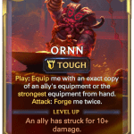 Level one Ornn is a seven-drop 4/4. His stats are small compared to the casting cost because when played, it’s equipped with an exact copy of an ally’s Equipment or the strongest Equipment in hand. Upon attacking, Ornn is granted +2/+2 stats from Forging twice. To level up Ornn, an ally has to strike for 10 or more damage.