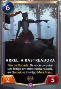 Wrathful Rider is a common five-mana unit with 7/3 combat stats and the Challenger keyword. Arrel, the Tracker is an epic six-mana unit with 2/5 combat stats and an end of round ability that has her strike the weakest enemy if you played a spell this turn that targeted her.