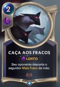 Hunt the Weak is a rare two-mana Slow spell that discards the weakest follower from the opponent’s hand. Brutal Huntress is a rare four-mana unit with 3/3 combat stats, the Challenger keyword, and an ability that gives her Quick Attack for the round that she’s summoned.