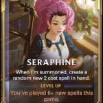 Leveling Seraphine up requires six or more spells during that game. Upon leveling up, her base stats increase to 2/5. Seraphine level two still creates a two-cost or less spell upon summoning. And when you play a new spell that costs two mana or less, her level two ability copies that spell and hits the same target as the original.