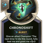 Chronoshift is a Rare seven-mana Burst spell that gives an allied champion a temporary buff that lasts for one round and prevents its death and grants it a permanent +3/+3 instead. While it may be difficult to find consistent use of this card in an actual deck, Chronoshift is Zilean’s Champion Spell, so there’s a good chance it can find fringe use when you already have a Zilean on the board.