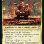 Featuring Mardu colors RWB (Red, White, and Black) with go-wide token and sacrifice strategies is the Hail, Caesar Precon. The face commander for the MTG Fallout deck is Caesar, Legion’s Emperor who has three modal options that players can choose two of when the human solder attacks and sacrifices another creature.