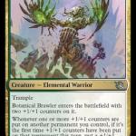 The Green and White MOM archetype has a theme of +1/+1 counters. Botanical Brawler, the Uncommon gold signpost, scales in power anytime counters are added to a permanent during that turn, synergizing with the Backup mechanic in the set as well.