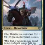 The WU archetype has a strong knight tribal theme designed into it. Marshal of Zhalfir is a two-drop lord for knight tribal decks. The other gold signpost cards in WU can support knights but instead, have staple effects and abilities that synergize with the colors Blue and White as a whole.