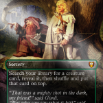 All cards from the main LTR set, along with Rare and Mythic Rare cards from LTR Commander Precons, may show up in a Special Edition collector booster pack with a Showcase Scroll frame treatment. The Showcase cards come in non-foil and with a silver foil treatment. Possible chase cards with the Showcase Scroll treatment are reprints of the nine Nazgûl cards.