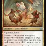 Signpost Common and Uncommon cards for the Boros Mouse Bloomburrow Draft archetype are Seedglaive Mentor and Veteran Guardmouse. Seedglaive Mentor is strong enough to pull you into the Mouse archetype, but I’m not a big fan of Veteran Guardmouse. The hybrid four-drop isn’t a good finisher unless you have a way to target it. Instead, I prefer to run the hybrid BLB Common Seedpod Squire.
