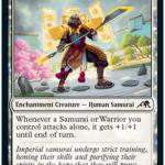 Providing late-game power, Greater Tanuki is a 6/5 with Trample that can also search up a basic land during the early game via Channel. There’s also Sky-Blessed Samurai, a 4/4 creature with Flying that has its cost reduced by one for every Enchantment you control. And Sunblade Samurai can search out a basic land via Channel while gaining you life during the early game or hit the battlefield later as 4/4 with Vigilance.