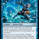 Dokuchi Silencer has a Ninjutsu cost of 1B with an ability that lets you destroy an opponent’s creature or planeswalker upon discarding a card and dealing combat damage to your opponent. And Covert Technician has a Ninjutsu cost of 1U with an ability that lets you put an Artifact onto the battlefield from your hand that has a mana value equal to or less than the combat damage that was dealt.