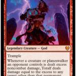 - First ability: Whenever a creature or planeswalker an opponent controls is dealth excess noncombat damage, Toralf deals damage equal to the excess to any target other than that permanent.