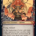 The Demon Rakdos has emerged from his lava pit in Murders at Karlov Manor to witness a performance worthy of his attention. Fitted with 6/6 stats and keywords like Flying and Trample, the Mythic Rare Demon forces opponents to sacrifice permanents at the beginning of your end step. And if they don’t, you get to draw two cards.