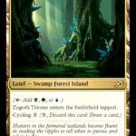 The release of IKO showcased three-color mana fixing with Triome lands Zagoth Triome, Savai Triome, Ketria Triome, Indatha Triome, and Raugrin Triome. The set of lands forms an enemy wedge cycle with a focus on the central color, flanked by two allies.