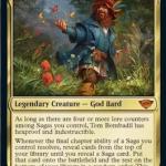 The passive and regular abilities for Tom Bombadil are flavorful but not practical outside of a build that focuses on Sagas. He is a potential commander of a Saga deck, having all five colors in his casting cost, along with the ability to essentially fetch another Saga when one on the battlefield runs out of chapters and stories to tell.