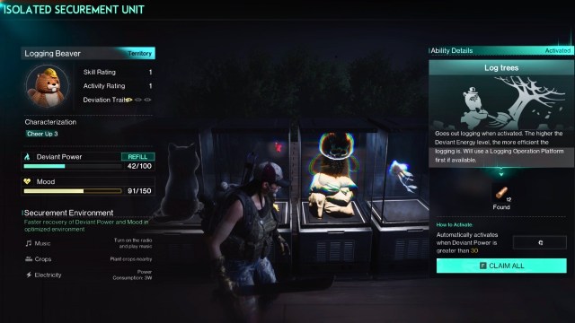 To use the Logging Beaver in Once Human, you must place it in an Isolated Containment Unit at your base. If it has over 30 Deviant Power, it will automatically go out and start logging the trees in the area. You can then change this number using the cog icon next to the “how to activate” section. When its power hits zero, it’ll become dormant. The Logging Beaver Deviant becomes more efficient with more Deviant Energy it has.