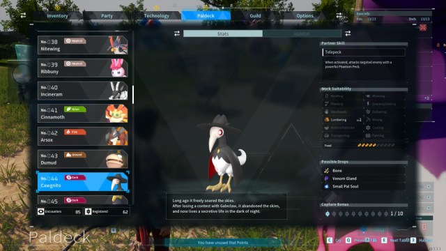 Catching Cawgnito isn’t too challenging. You can encounter them at level 15 in night time. Since it’s a Dark-type Pal, it’s recommended to bring Dragon Pals in your team to battle it, and a stock of Spheres to catch it.
