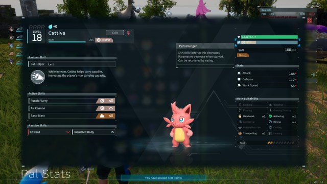 If you’re on a material farming spree for things like Wood, Stone, Ore, or anything else, adding Cattiva to your party is a wise step as their Partner Skill boosts your Weight capacity by 50—allowing you to carry more.