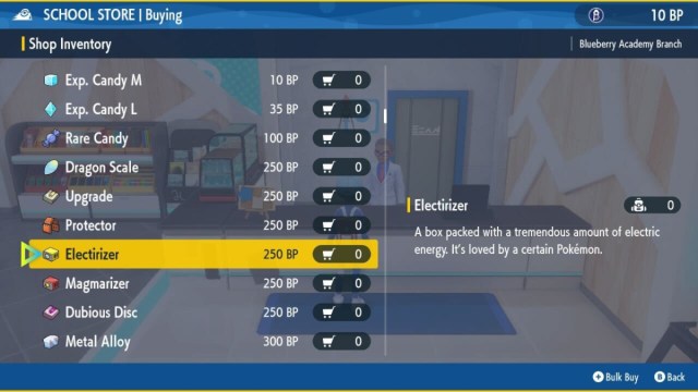Like several other evolution items, the Electirizer is available to buy at the School Store in Blueberry Academy for 250 BP. If you’ve not yet got access to the School Store, you need to start The Indigo Disk DLC and progress through the early stages until shown to your Dorm Room, and then you’ll be free to explore.