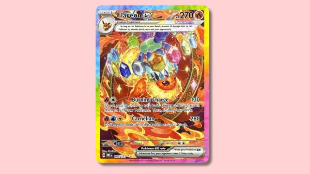 Flareon ex is one of the more visually striking cards in the set, with a kaleidoscopic color scheme and dynamic design.
