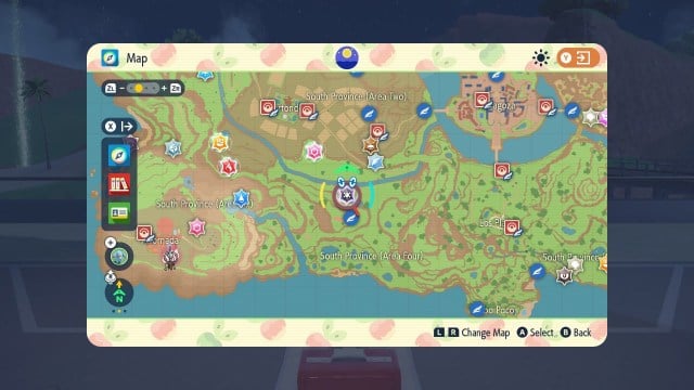 - Open up your map and look for the black crystal Tera Raid icon with the Ice Tera Type symbol. Set that as your destination.