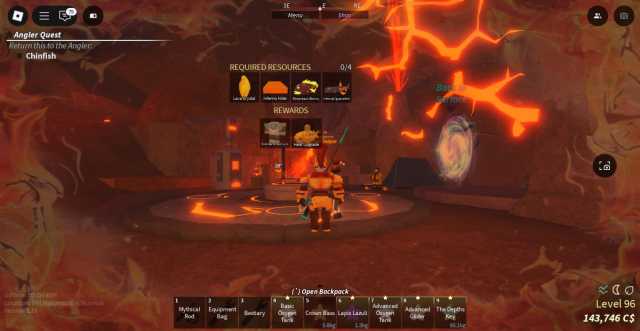 The next step is to fish for the Infernal Iguanafish, Inferno Hide, and Blisterback Blenny. To fish in Magma, you need a special Exalted enchant on your fishing rod or have one of the two special fishing rods with that capability.