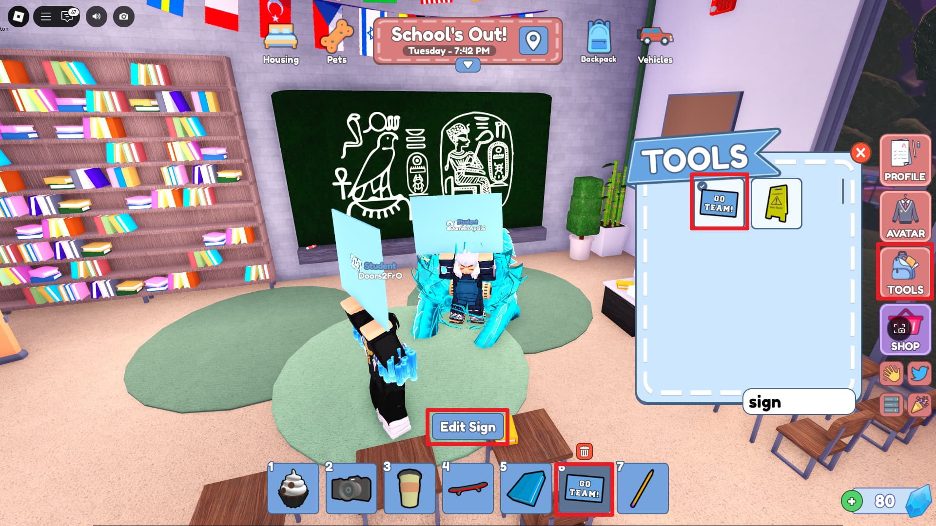 Then, interact with the blackboard until there are ancient Egyptian signs on it. Open up the tools menu and equip a pen and a holdable sign from it. Hold out the sign and edit it to say “247.”