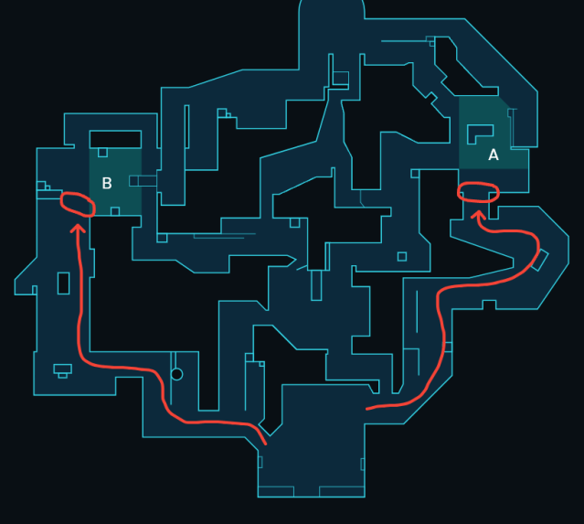 The problem with using both of these strategies is that inevitably, your team is going to get bottlenecked at the two choke points circled in the image above. It is extremely easy for a singular VALORANT enemy to place a smoke that will completely cover these choke points and prevent your team from doing anything.