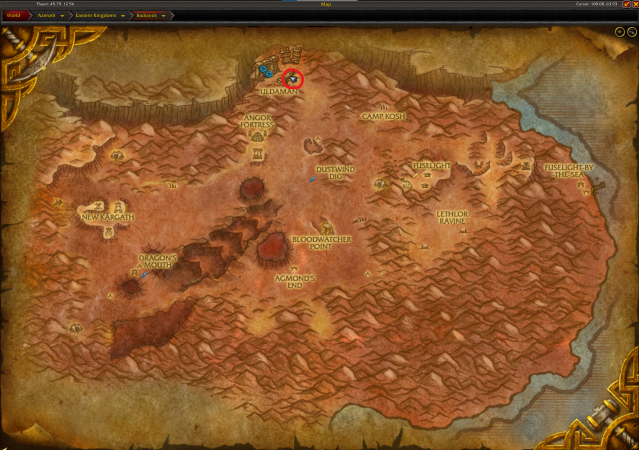 To get to Uldaman, fly to the Badlands in the Eastern Kingdoms. For the Horde, the nearest flight path is New Kargath. For the Alliance, Dustwind Dig is the best option. Thelsamar in Loch Modan is also a suitable flight path for Alliance players since the zone borders the Badlands to the north. Regardless of your faction, though, you’ll want to travel to the northernmost point in the Badlands upon your arrival in the zone.